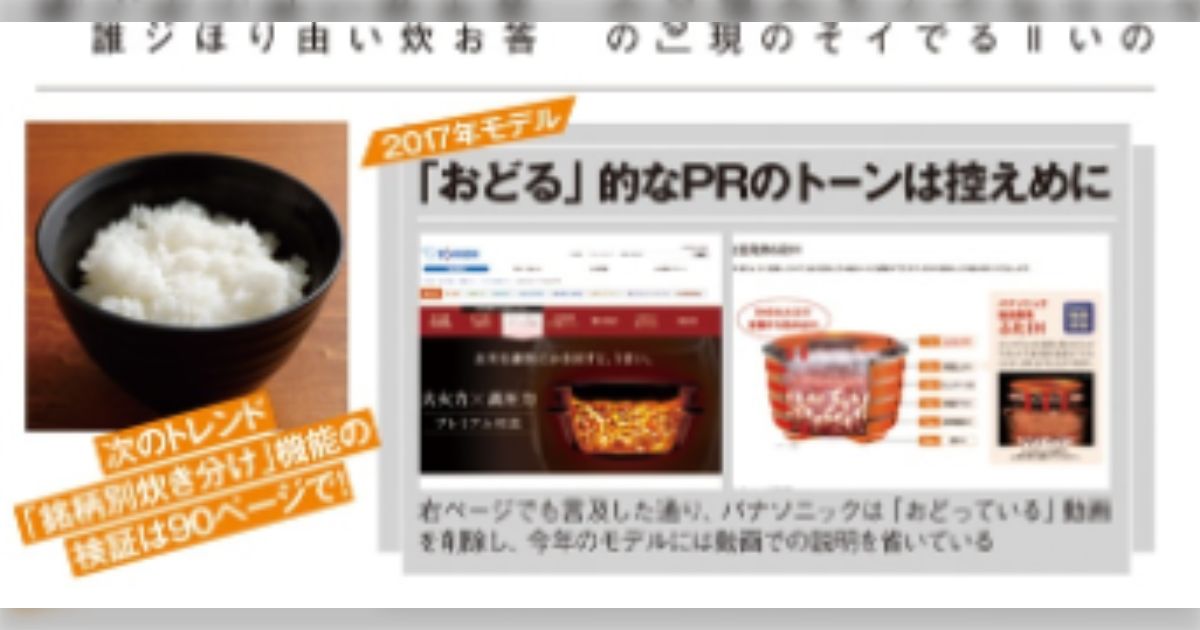 ちなみに「おどり炊き」とか「炎舞炊き」とか、直近の最高級炊飯器はだいたい「米が窯の中でぐるんぐるん循環したり、めっちゃ動いたりする」みたいなことを言っちゃったり仄めかしてウリにしてる頭の悪い機種が多いんだけど、実際おどらないらしいよ 消費者庁に怒られてたね 普通に考えたらわかるんだよそんなこと 本当にそういう嘘ついて高付加価値のフリするのを本当にやめろ馬鹿ども